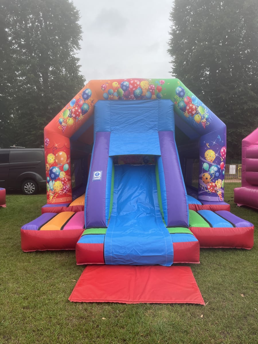 This new combo castle has a centre slide with entry to the left and right. It has plenty of jumping space inside and mesh sides so you can see the children.