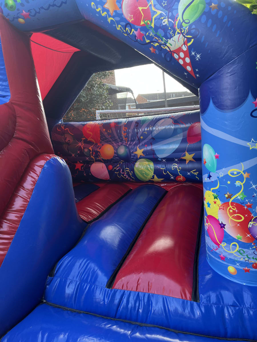 Kids can bounce around inside before climbing up and enjoying the small slide, which is designed to be fun without being too steep or scary. The bright, colourful party-themed design makes it really eye-catching, while the enclosed sides and high walls help keep little ones safe during play.